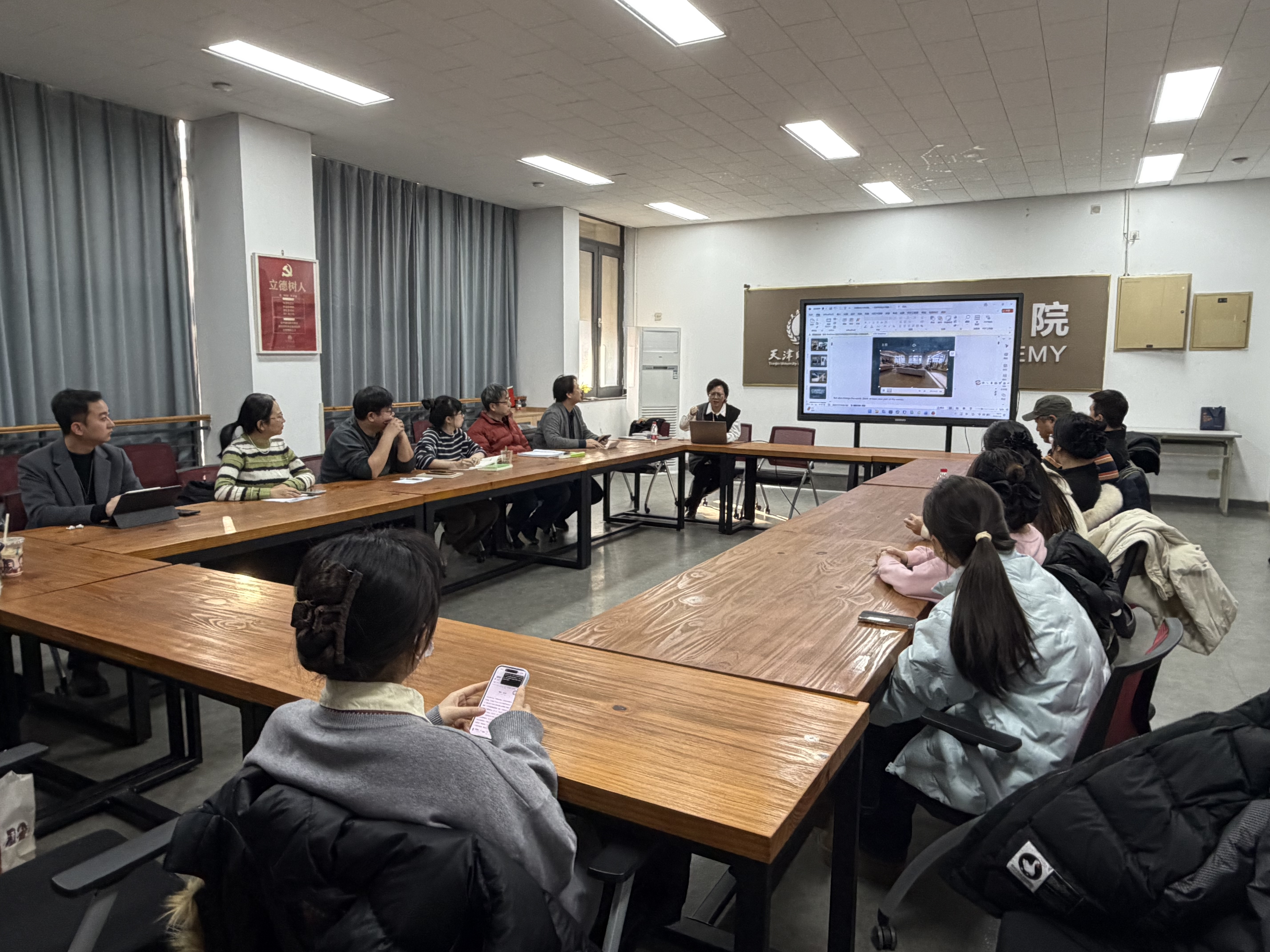 为进一步提升研究生导师队伍的指导水平与综合素养,优化艺术学科研究生培养体系,推动学科建设提质增效,2026年1月6日下午2:00,天津财经大学艺术学院举办全体硕士生导师培训活动。本次培训特邀天津商业大学艺术学院副教授、英国金斯顿艺术学院访问学者、独立策展人刘巍老师主讲,活动主题为《从工作室到博物馆 实践性赋能未来设计之道——英国金斯顿艺术学院教育理念与教学模式》。学院全体硕士生导师及部分学生代表共计18人参加会议,共同学习探寻国际先进教育理念与本土研究生培养实践的融合路径。